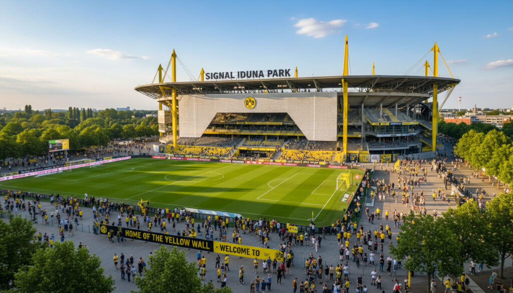 Signal Iduna Park, også kjent som Westfalenstadion, har kapasitet til 81 365 tilskuere og er kjent for sin «Yellow Wall». Stadionet har fleksible åpningstider avhengig av kampdag og arrangement, med tydelig skilting for inngang og fasiliteter. Ytterligere detaljer finner du på Offisiell Signal Iduna Park-side.